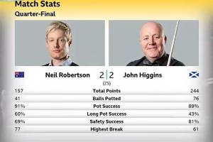 约翰·希金斯61分拿下首局,第二局尼尔·罗伯逊单杆77分完成逆转,约翰·希金斯打出单杆61、54、56分,尼尔·罗伯逊打出单杆77分。上半场结束,希金斯2-2罗伯逊。