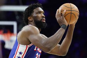全场恩比德出战38分55秒,23投12中,三分5中0,罚球10中9,轰下33分4板8助1帽,正负值+13。