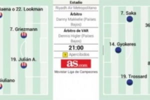 体育资讯4月29日讯 北京时间4月30日3点,欧冠半决赛首回合,马竞对阵阿森纳,《阿斯报》赛前预测双方首发阵容。