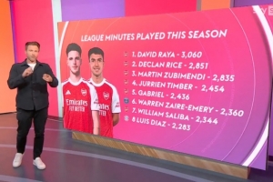 天空体育统计了参加欧冠半决赛球员本赛季联赛的出场时间,并列出榜单,阿森纳球员包揽前5名,前8名中占6席。