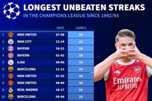 体育资讯4月30日讯 本轮欧冠半决赛,阿森纳作客1-1战平马竞达成连续13场不败,《转会市场》也统计了自92-93赛季改制以来的欧冠最长连续不败榜,曼联25场独自领跑。